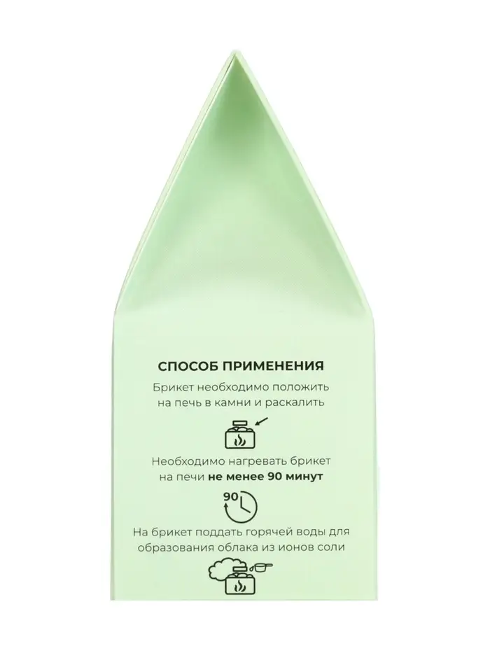 Применение: нагревайте брикет на печи не менее 90 минут, затем поддайте на него горячей воды. Соль наполнит воздух бани ионами, тем самым поможет снять усталость, улучшить кровообращение и общее самочувствие.
