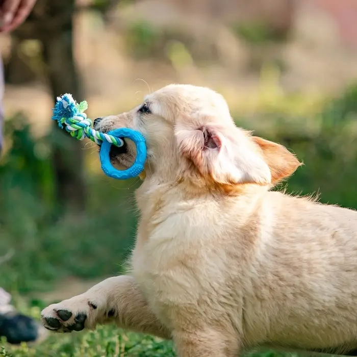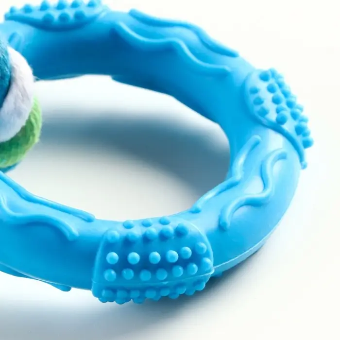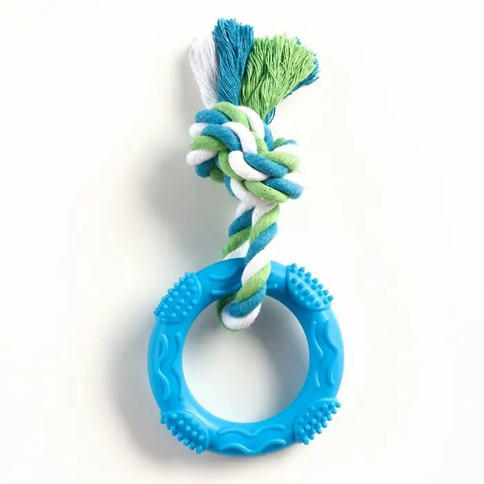 - Двойная функциональность: Цельное кольцо из термопластичной резины идеально подходит для жевания и игр на апорт. Оплетка из прочного текстильного каната превращает игру в перетягивание, массажируя десны и бережно очищая зубы от налета.