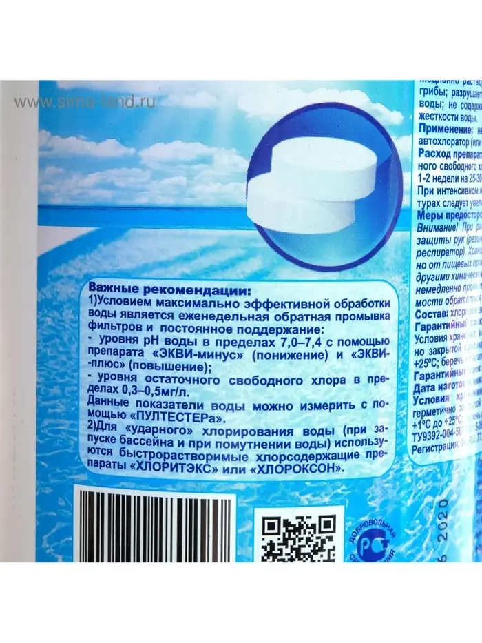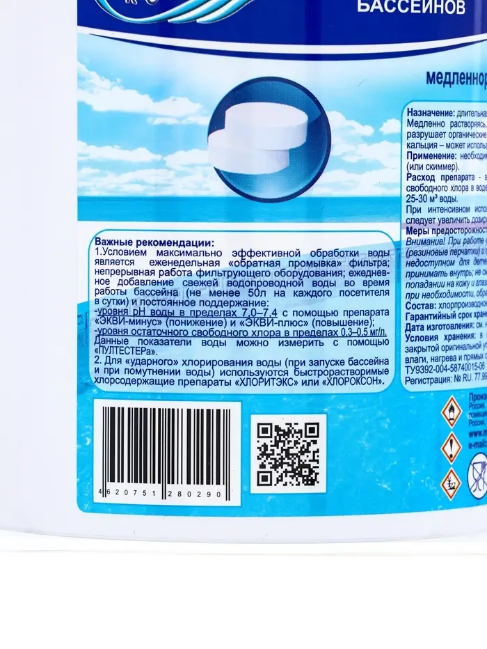 Применение: необходимое количество таблеток помещают в автохлоратор (или скиммер).