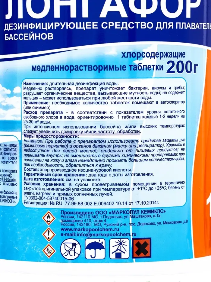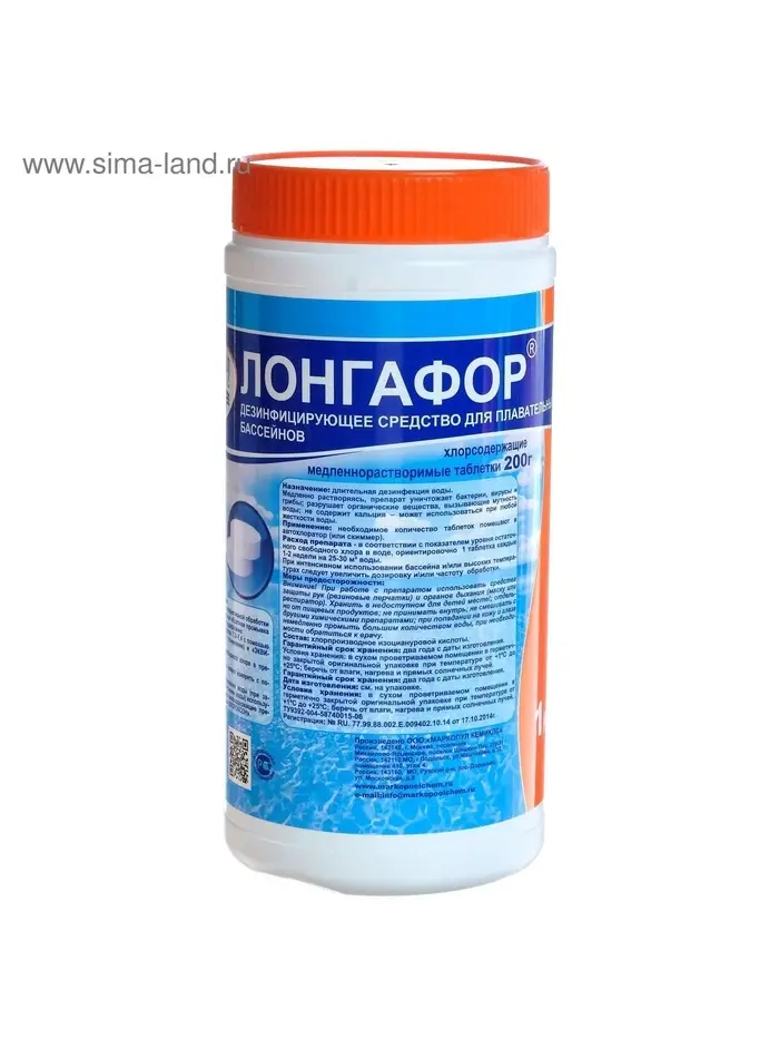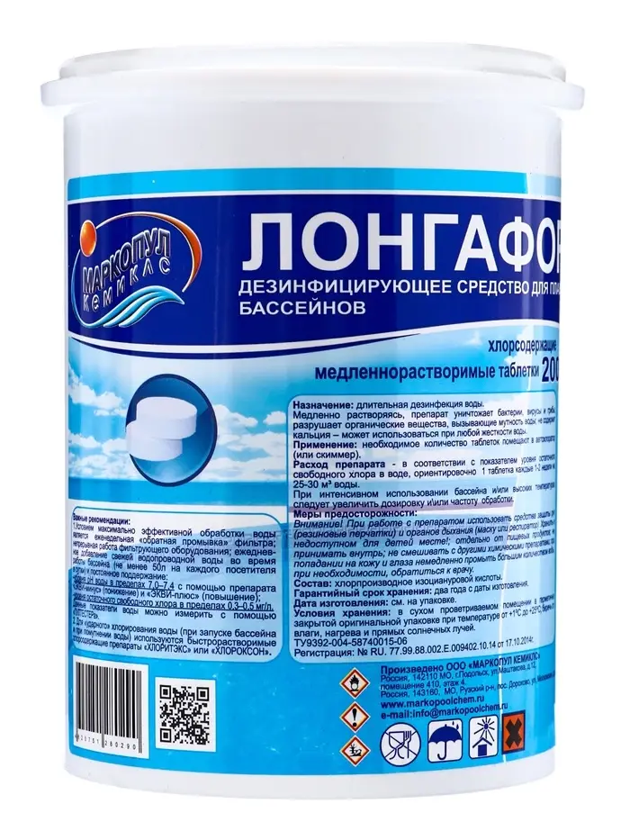 Назначение: длительная "хлорная" дезинфекция. Возможна отгрузка химии для бассейнов оптом партиями уже от 1 гофроящика. Химия для бассейнов "Лонгафор" в течение длительного времени воздействует на бактерии, вирусы и грибы, хлор разрушает органические вещества, вызывающие мутность воды бассейна; препарат противодействует росту микроспор зелёного планктона в открытых бассейнах, имеет осветляющий эффект, не содержит кальция.