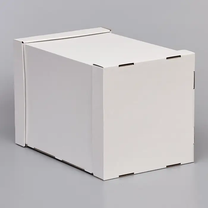 - Максимальная защита конструкции: Плотный белый картон (280 г/м²) и усиленные углы создают жёсткий каркас. Коробка защищает нежный крем, мастику и декор от сминания, тряски и случайных касаний во время перевозки, даже если торт высокий и сложный.