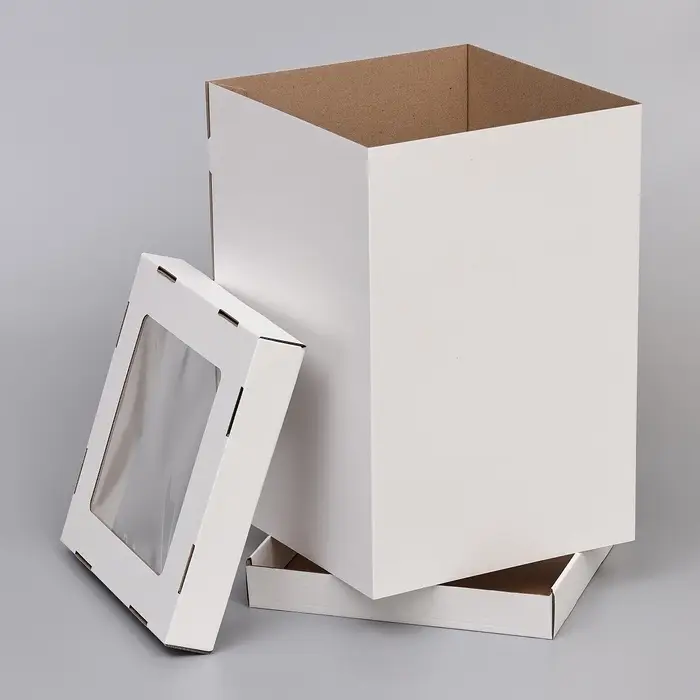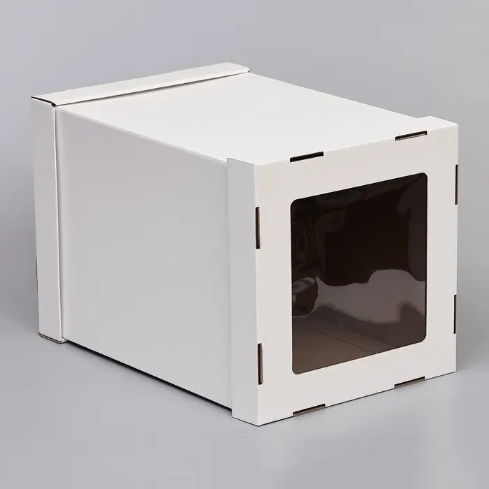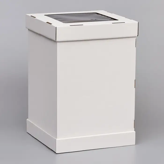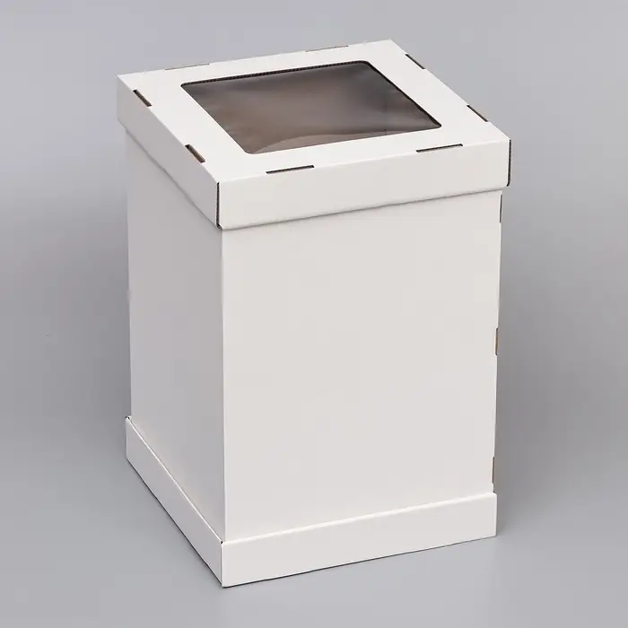 Великолепие на виду, надёжность внутри. Большая белая коробка для торта с окном — это профессиональная упаковка для многоярусных и крупных праздничных тортов. Её размер и прозрачная стенка позволяют безопасно транспортировать и эффектно демонстрировать кондитерское изделие.