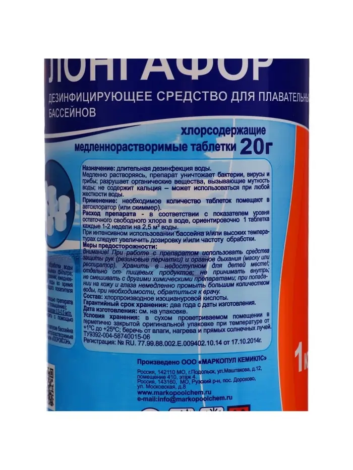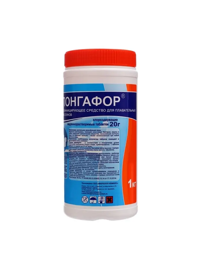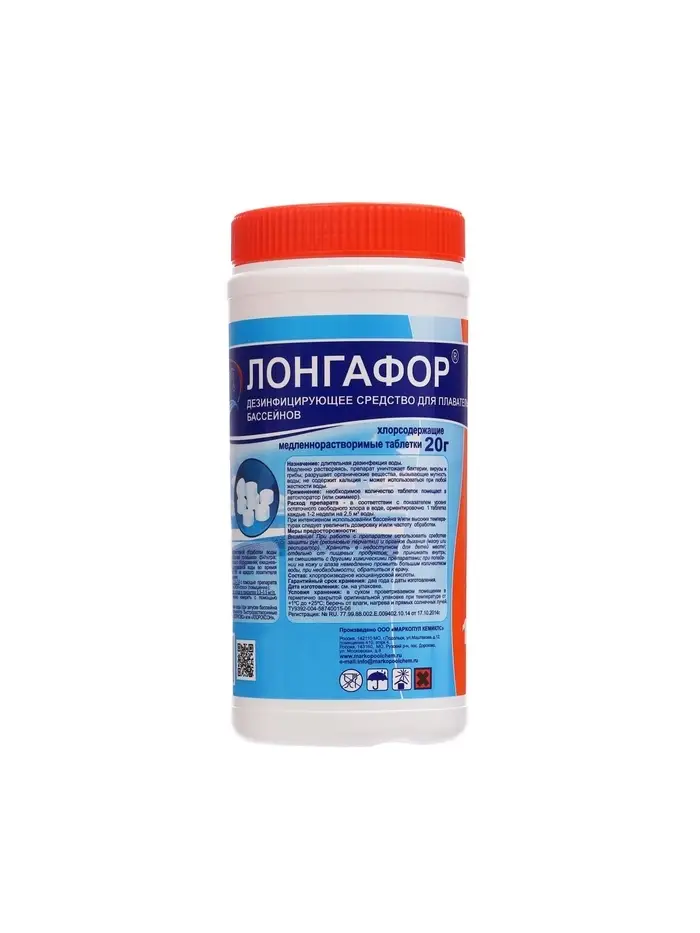 Назначение: длительная "хлорная" дезинфекция. Возможна отгрузка химии для бассейнов оптом партиями уже от 1 гофроящика. Химия для бассейнов "Лонгафор" в течение длительного времени воздействует на бактерии, вирусы и грибы, хлор разрушает органические вещества, вызывающие мутность воды бассейна; препарат противодействует росту микроспор зелёного планктона в открытых бассейнах, имеет осветляющий эффект, не содержит кальция.