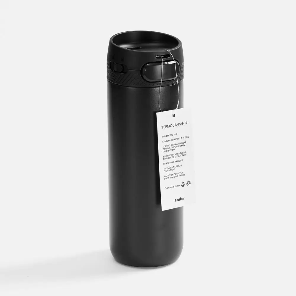 Специально спроектированная конструкция термостакана Andor со съемной кнопкой и отверстием для подвеса на крышке открывает простор для различных вариантов кастомизации и нанесения изображений. На изделии и упаковке нет айдентики бренда, а название бренда с картонного лейбла легко удалить.
