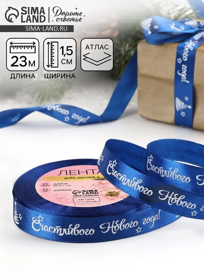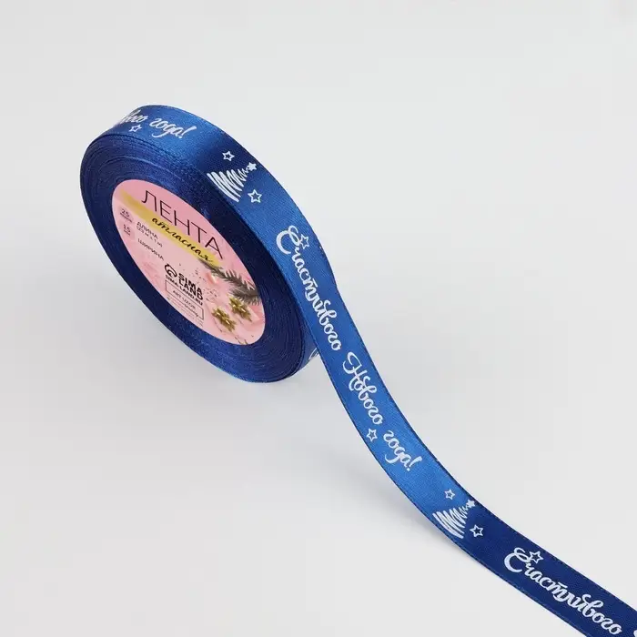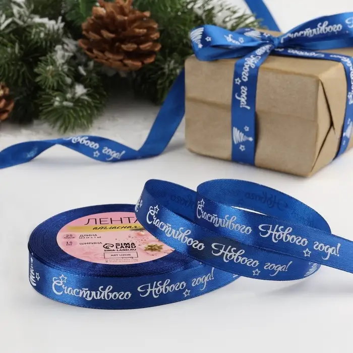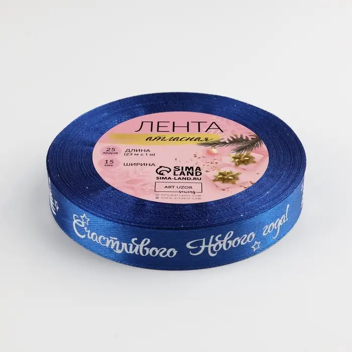 Лента атласная «Счастливого Нового года!», 15 мм, 23±1 м, синяя