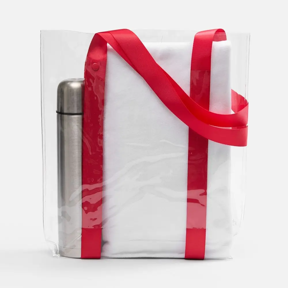 Прозрачные сумки никогда не выйдут из моды. А цветные ручки легко впишутся в брендбук и точно передадут настроение, которое хотелось бы транслировать.