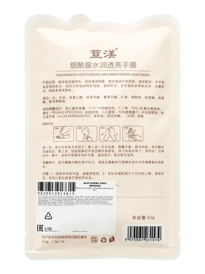 Способ применения: вымойте руки тёплой водой. Откройте упаковку и наденьте маску-перчатки на руки. Рекомендуется надеть обычные перчатки поверх маски для лучшего соприкосновения с кожей. Через 15-20 минут снимите. Остатки средства равномерно распределите на кожу рук и локтей.