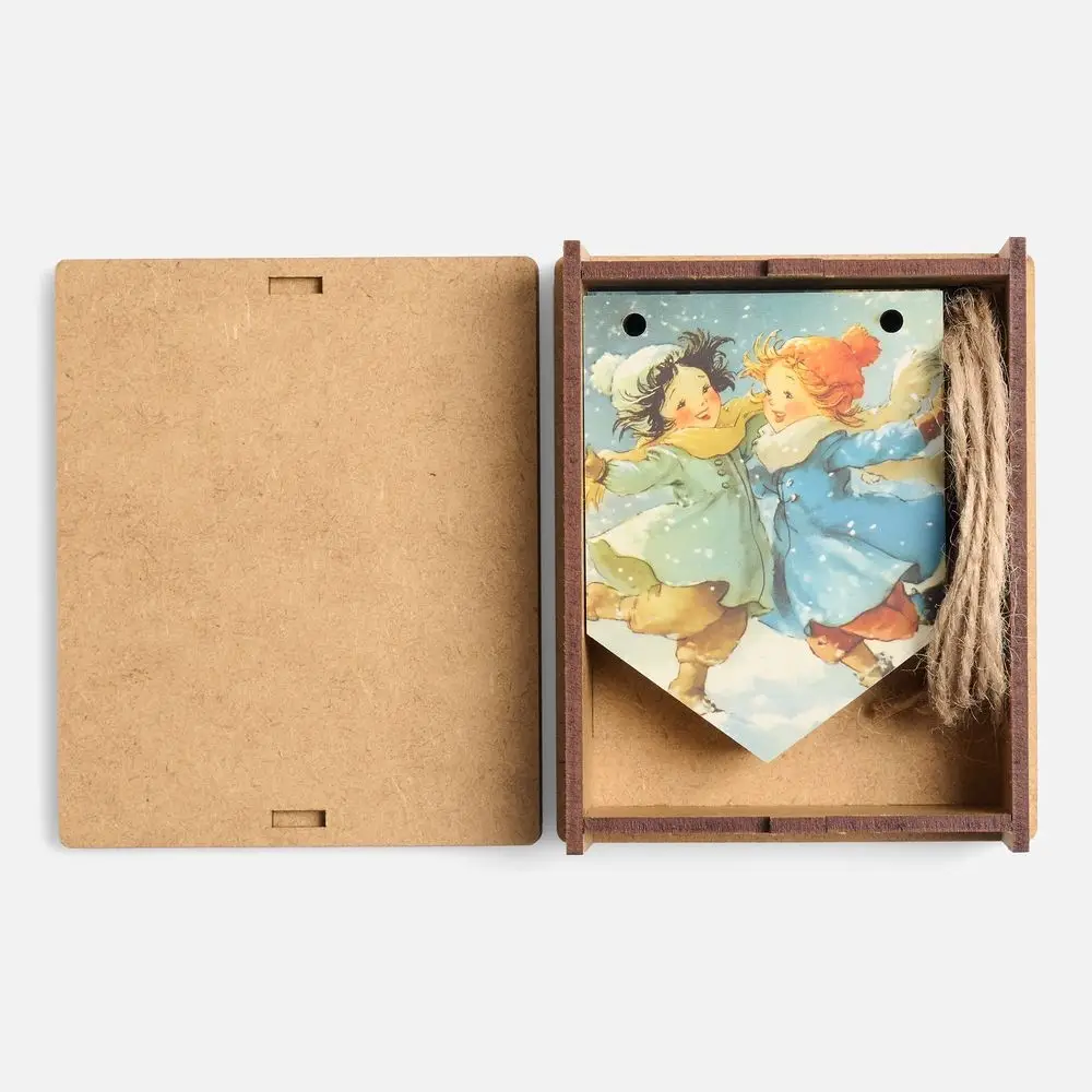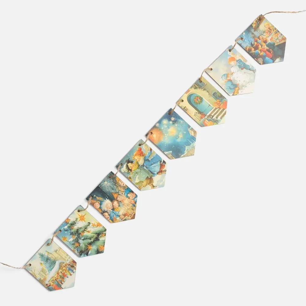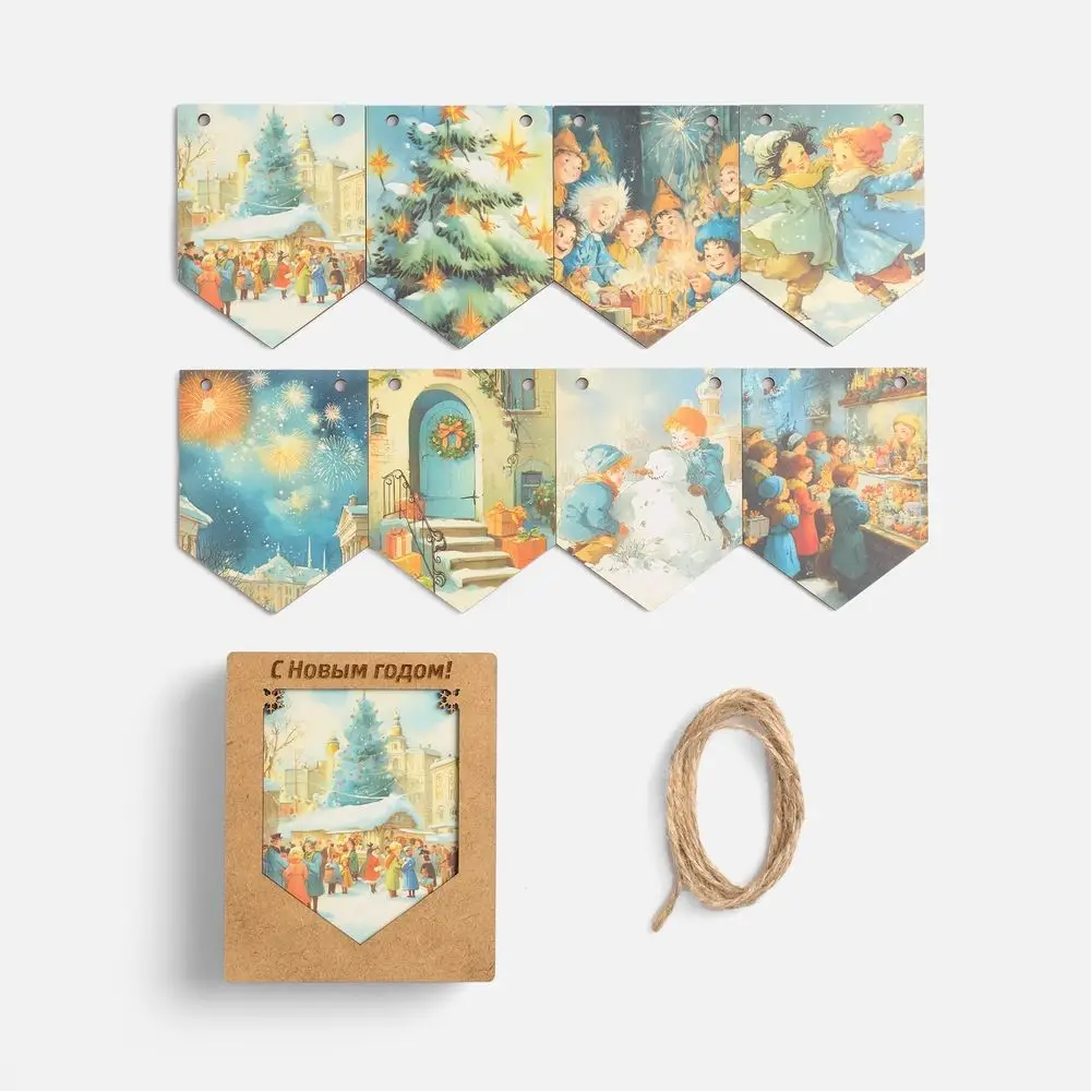 Очаровательная гирлянда из деревянных флажков с винтажными рождественскими иллюстрациями для создания уютной праздничной атмосферы дома или в офисе. Каждый флажок украшен теплым, душевным сюжетом — будто сошедшим со старинных открыток. Они с легкостью перенесут в мир новогодних сказок и детских фантазий — туда, где и хочется оказаться в самое волшебное время года!
