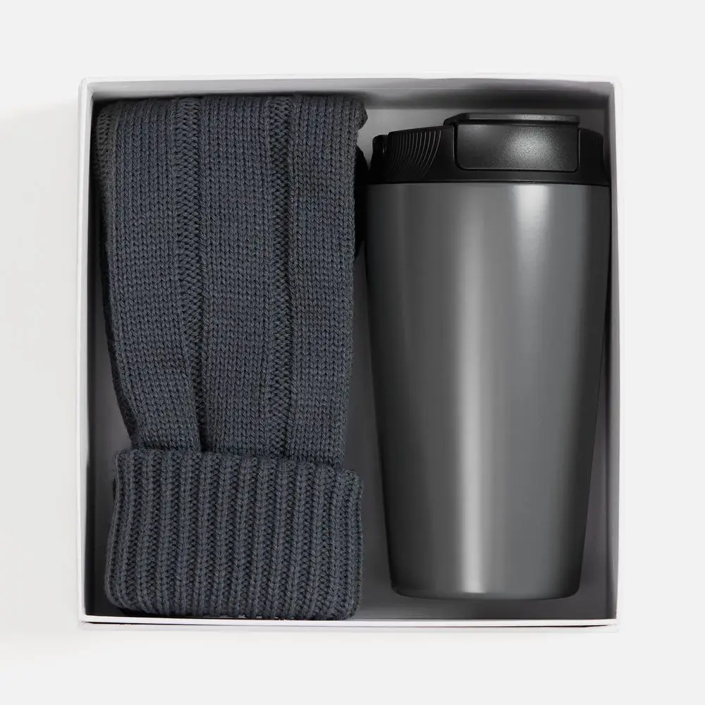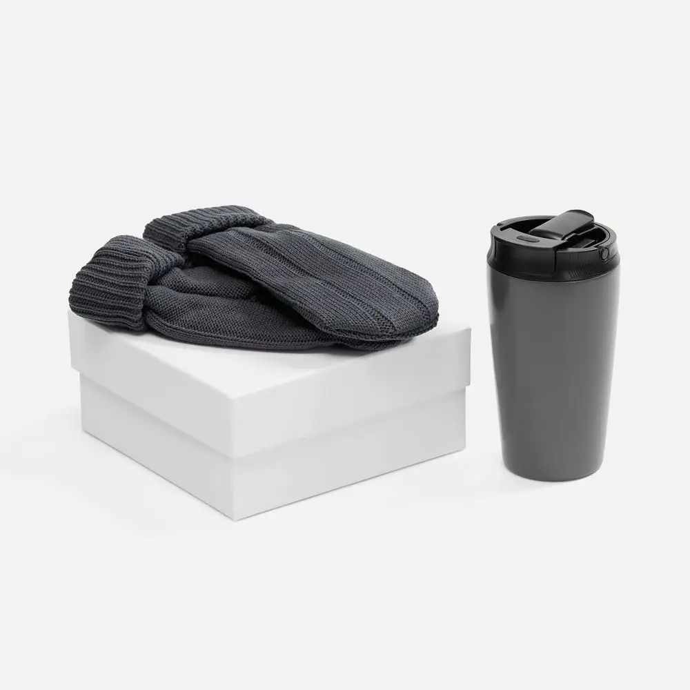термостакан - нержавеющая сталь; крышка - пластик; варежки - акрил 100%; подкладка - флис; коробка - переплетный картон, бумага Magic