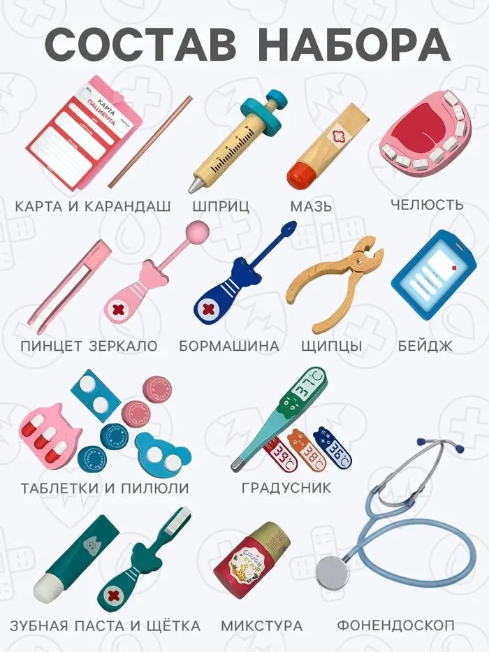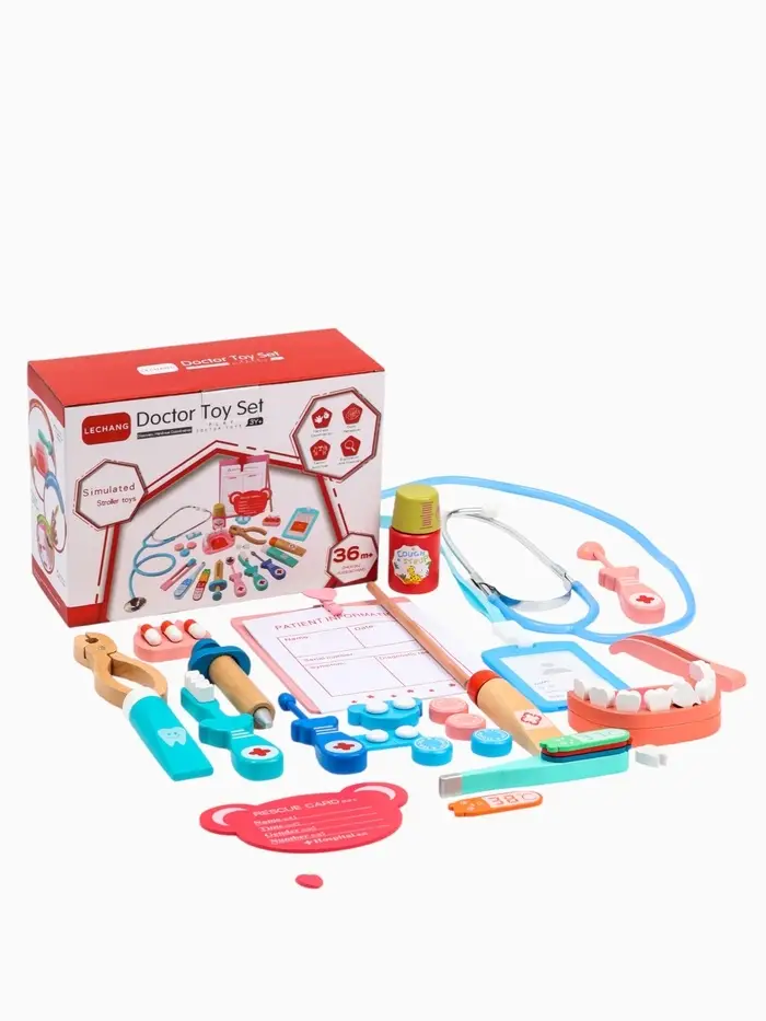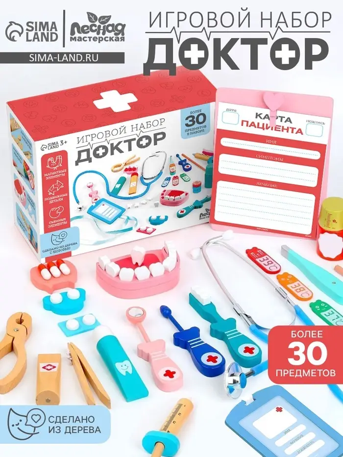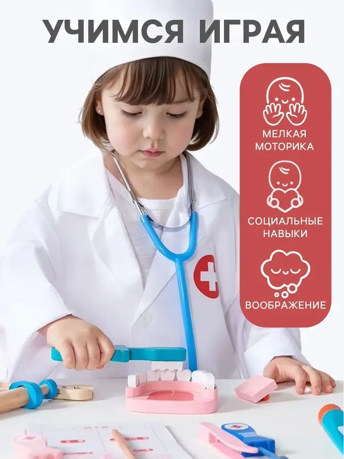 Набор «Маленький стоматолог» — это увлекательный игровой комплект из 33 предметов для сюжетно-ролевых игр. В набор входят деревянные инструменты и аксессуары, которые помогают ребёнку примерить роль врача и освоить основы ухода за зубами. Этот набор станет универсальным подарком на 8 Марта или любой другой праздник.