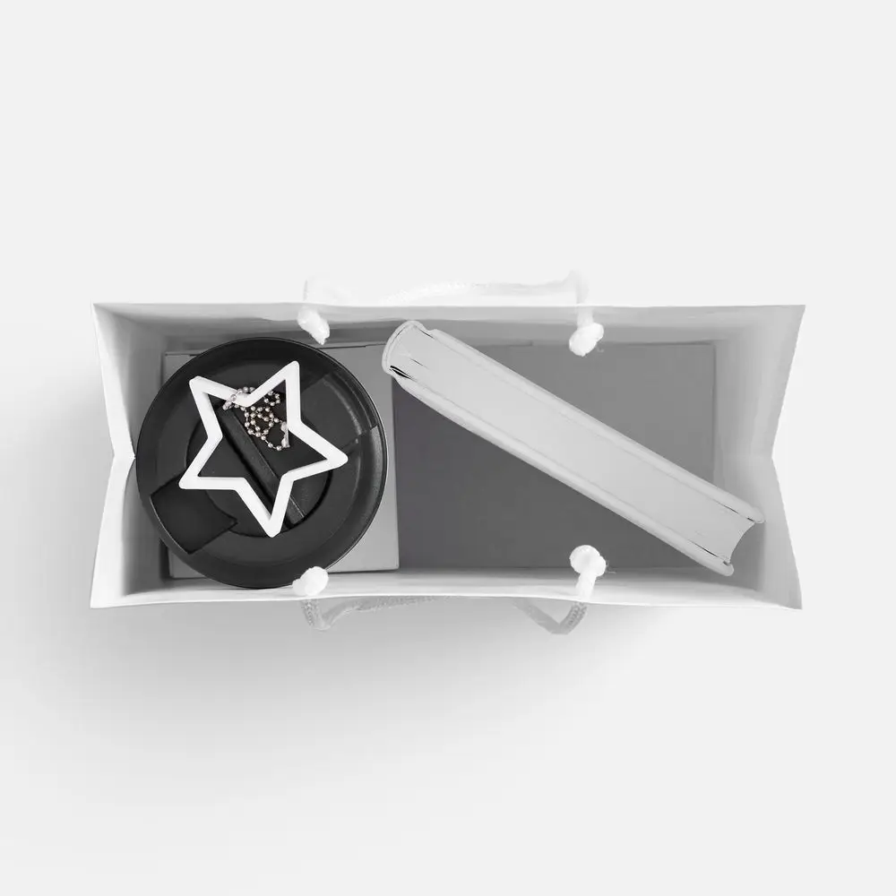 Набор Astrela универсален: это классика, приправленная оригинальным дизайнерским решением. 3D-звездочка в цвет всего набора украсит подарочный пакет, а позднее с легкостью станет акцентом повседневного образа. Подвеску легко прикрепить к рюкзаку или сумке, чтобы разнообразить привычный стиль: звездочка еще долго будет напоминать о приятном подарке и радовать получателя.