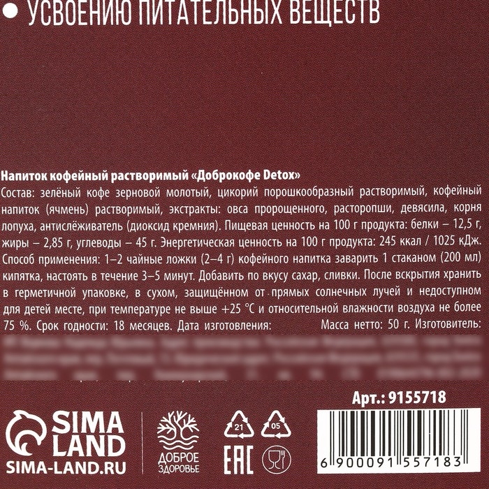 Кофейный напиток «Детокс»: зелёный кофе, цикорий, лопух, расторопша, девясил, овёс, 50 г.