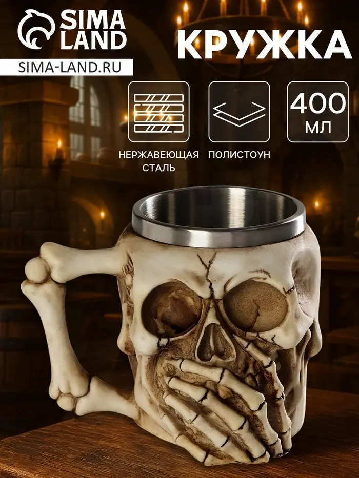 Кружка средневековая «Череп», 400 мл, 15×11×12 см, нержавеющая сталь, бежевая