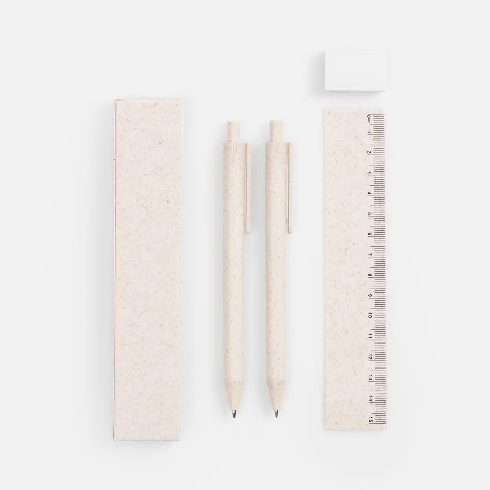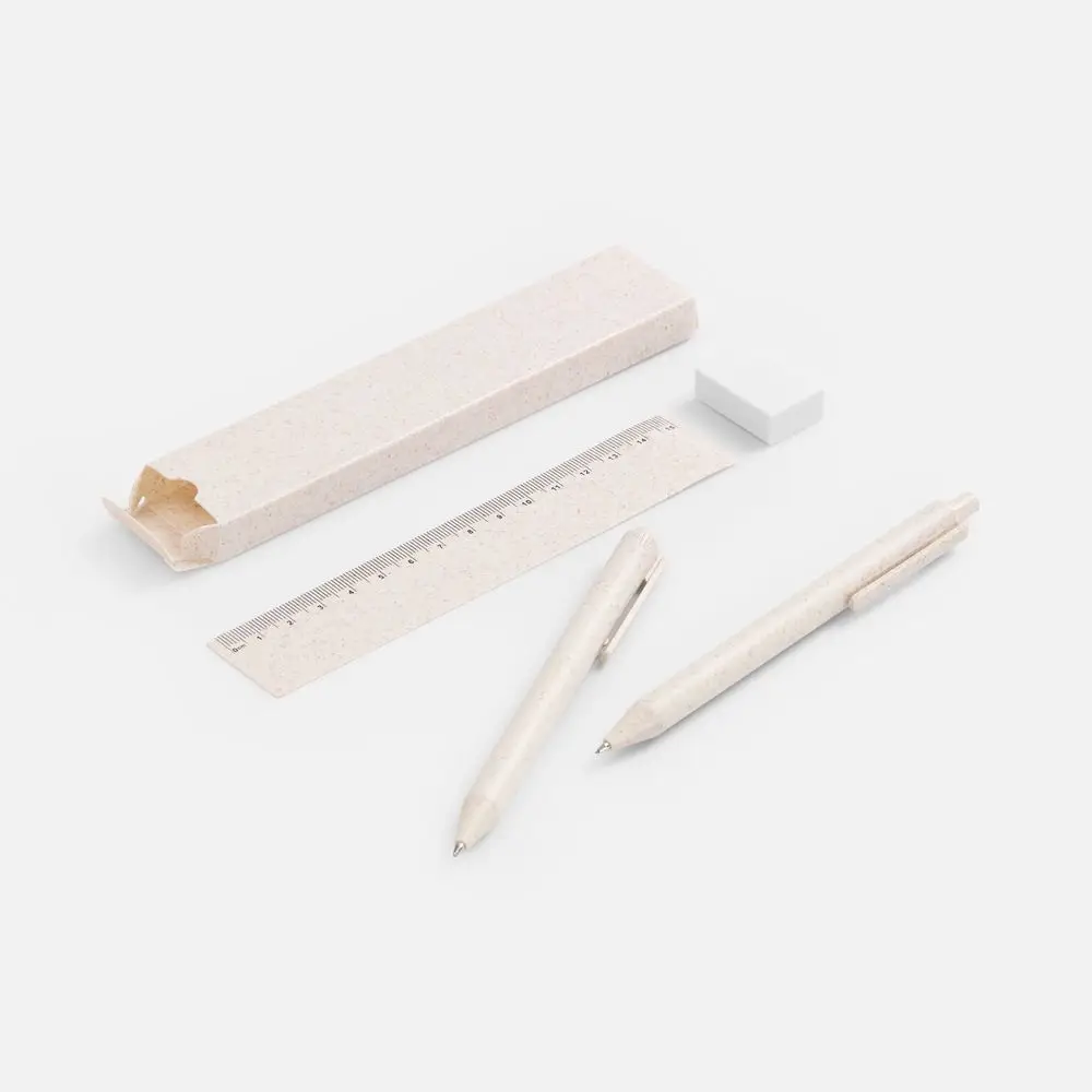 - В комплекте ручка, механический карандаш, линейка, ластик и упаковка.
