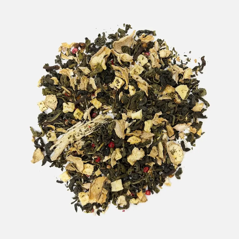 Зеленый крупнолистовой чай с кусочками имбиря, яблоком, гвоздикой и розовым перцем обладает многогранной палитрой вкуса и аромата. В состав чая входят только натуральные ингредиенты, а чайные листья предварительно вымачиваются в имбирном соке: вкус напитка становится особо насыщенным и обогащенным.