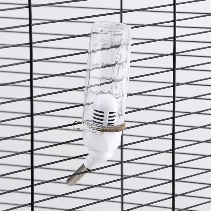 - Пружинное крепление из металла: надёжно удерживает поилку даже на тонких прутьях. Не расшатывается со временем и выдерживает активное поведение животного.