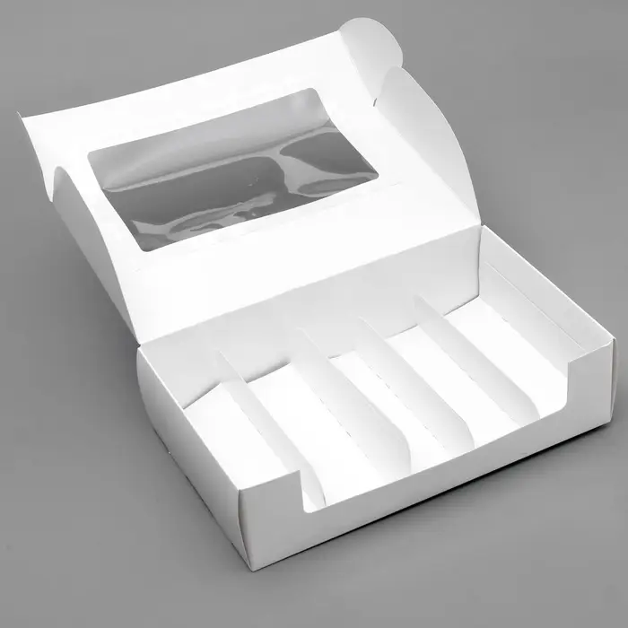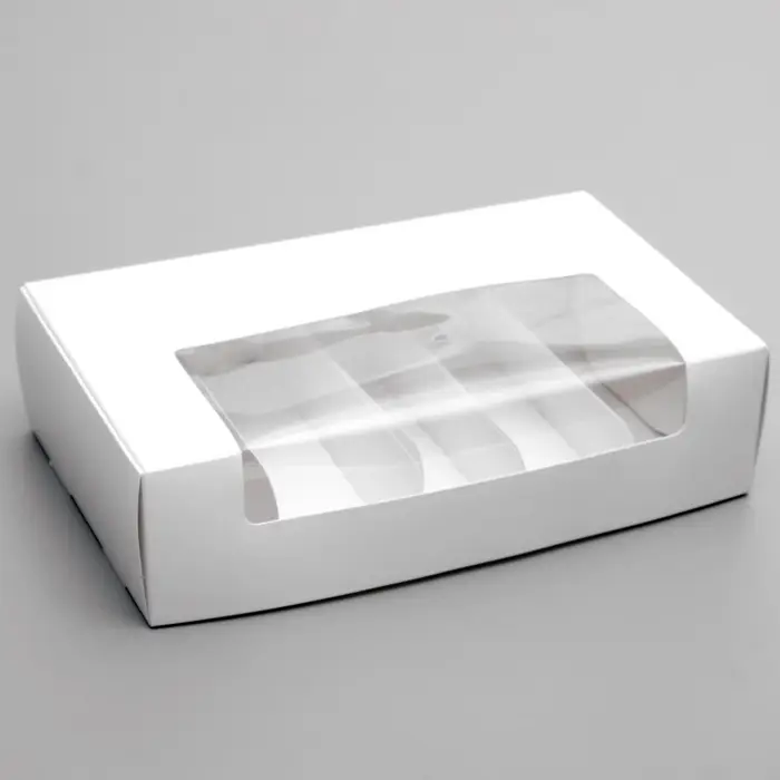 - Жёсткий белый каркас: Основа из плотного картона (250 г/м²) обеспечивает необходимую прочность, чтобы коробка не прогибалась под весом десертов. Белый цвет выглядит чисто и нейтрально, подчёркивая аппетитность содержимого.