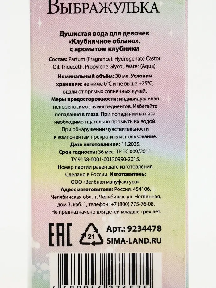 Детская душистая вода подходит в качестве первого парфюма. Аромат сладкий, лёгкий и нежный, не слишком насыщенный — как раз для маленькой леди.