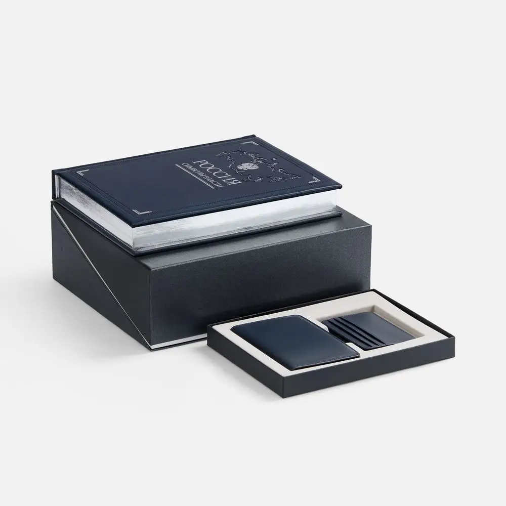 книга, обложка на паспорт, чехол - натуральная кожа; коробки - переплетный картон, коробка Artikus - переплетный картон, бумага Majestic