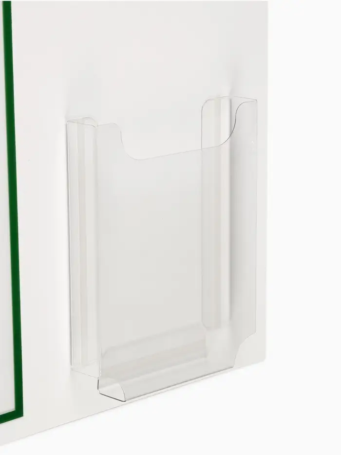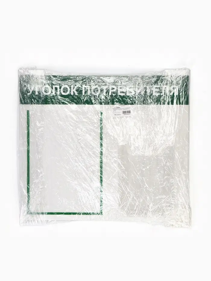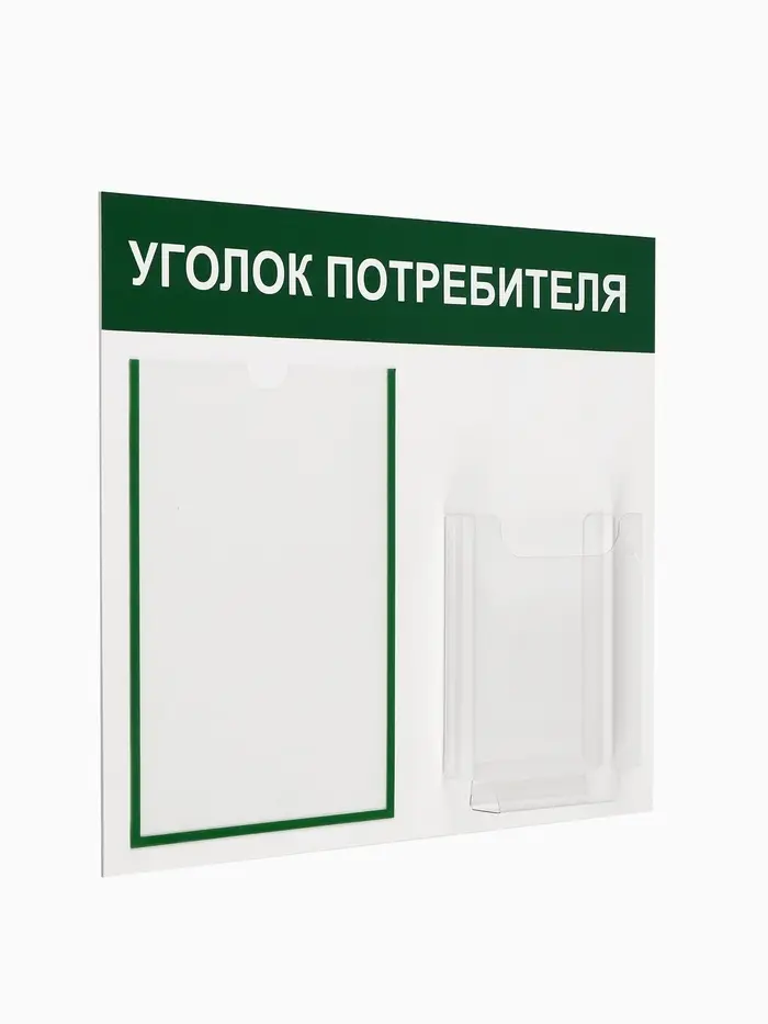 Информационный стенд «Уголок потребителя» на 2 кармана. Настенная конструкция из ПВХ, пластика и оргстекла выполнена в зелёном цвете и предназначена для обязательного размещения правовой информации в торговых и сервисных точках. Комбинированная система ячеек позволяет одновременно экспонировать лист А4 и печатную продукцию формата А5.
