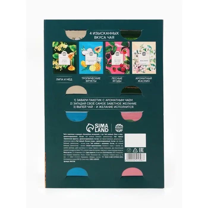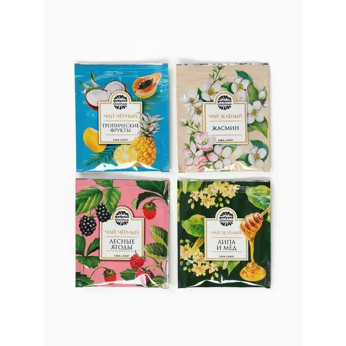 При оформление заказа, просим запрашивать актуальные сроки годности у менеджера Чай чёрный «Липа и мёд», ароматизированный. Состав: чай зелёный байховый, ароматизаторы пищевые. Чай чёрный «Лесные ягоды», ароматизированный. Состав: чай чёрный байховый, ароматизаторы пищевые. Чай зелёный «Жасмин», ароматизированный. Состав: чай зелёный байховый с лепестками жасмина. Чай чёрный «Тропические фрукты», ароматизированный. Состав: чай чёрный байховый, ароматизаторы пищевые. Масса нетто: 7,2 г (4 пакетика x 1,8 г) Срок годности: 36 месяцев.