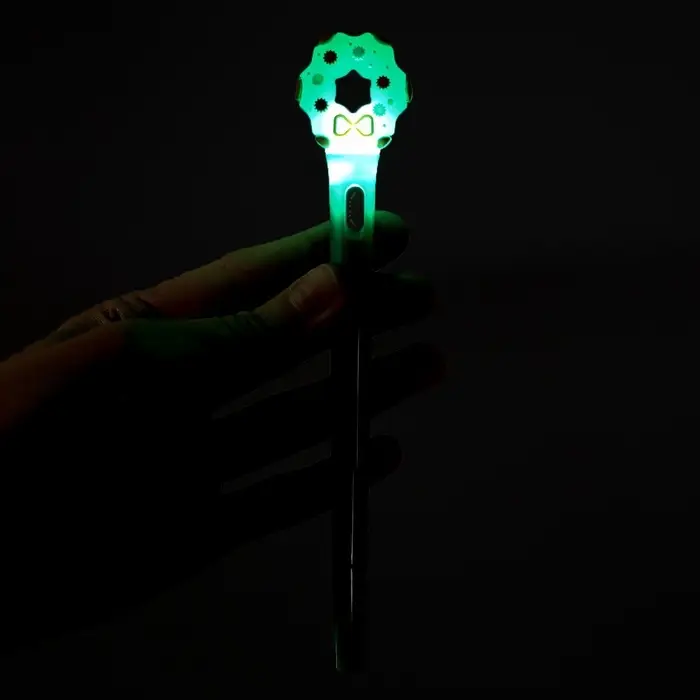 - Нажмите на кнопку, и фигурка на ручке загорится (батарейки есть в комплекте).