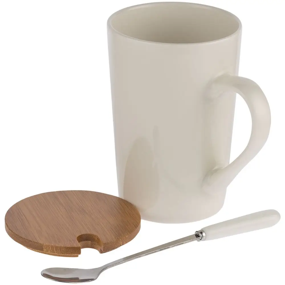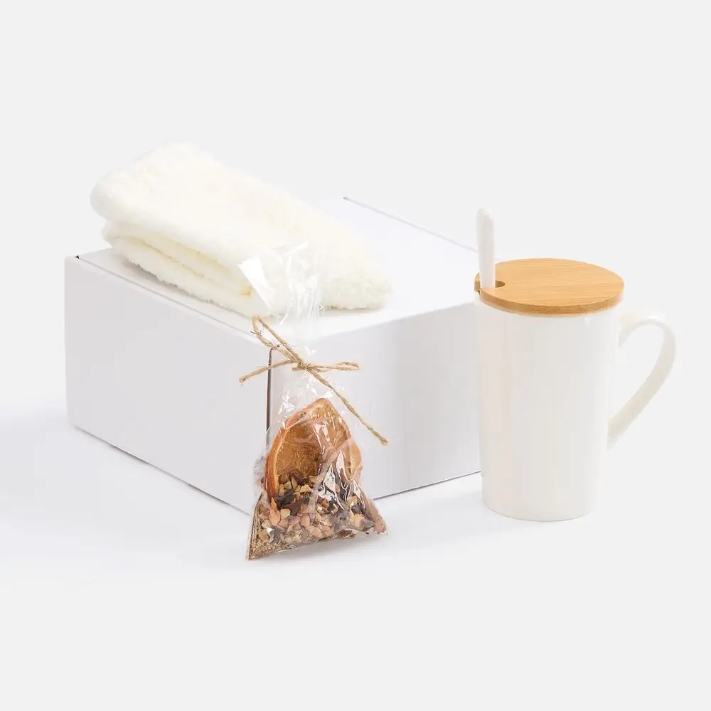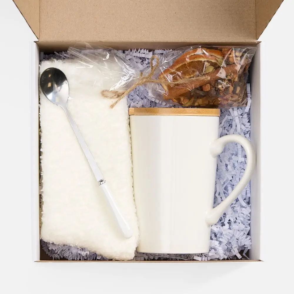 кружка - фарфор, крышка - бамбук; ложка - нержавеющая сталь; носки - полиэстер 100%; коробка - микрогофрокартон, Т-23Е