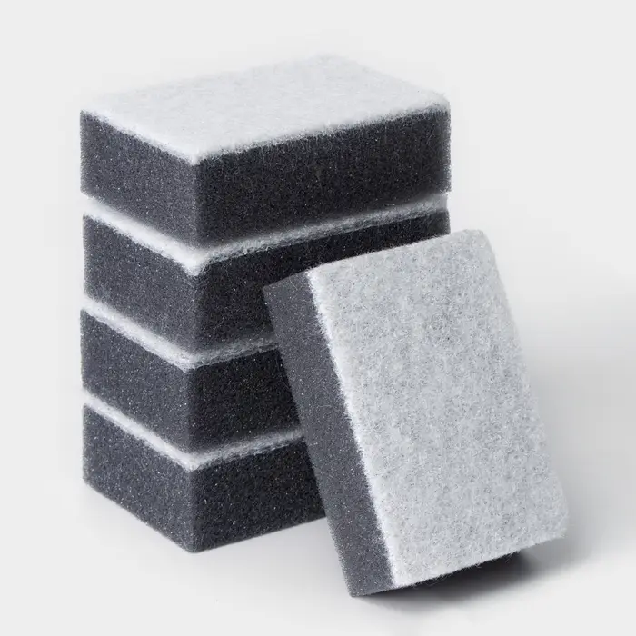 Забудьте о трудновыводимых пятнах и жирном налете! Наш набор из пяти губок с частицами активированного угля обеспечит безупречную чистоту вашей посуды.