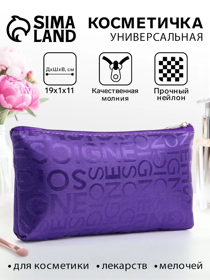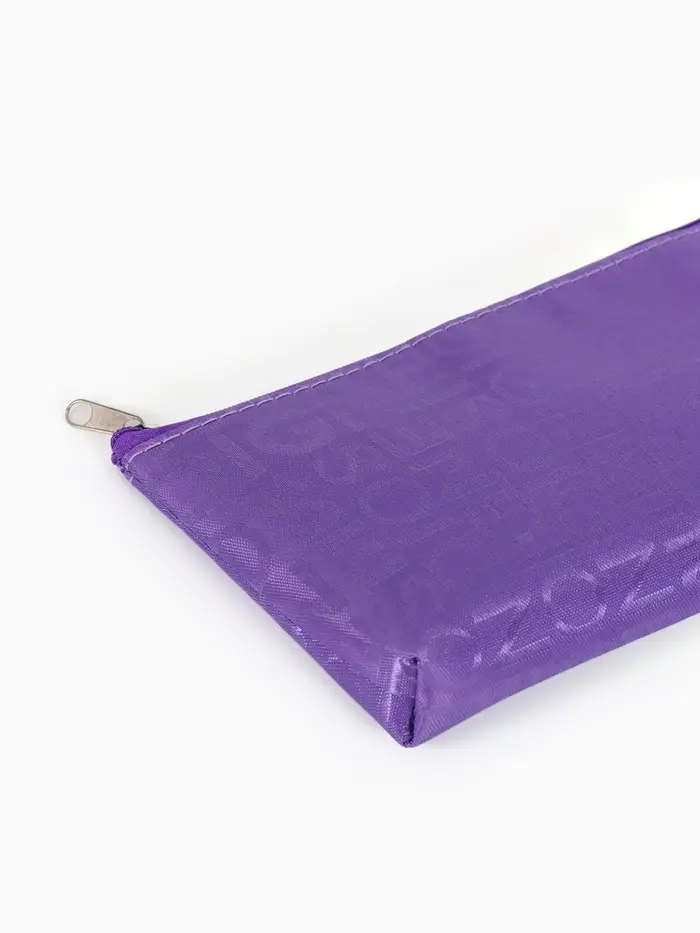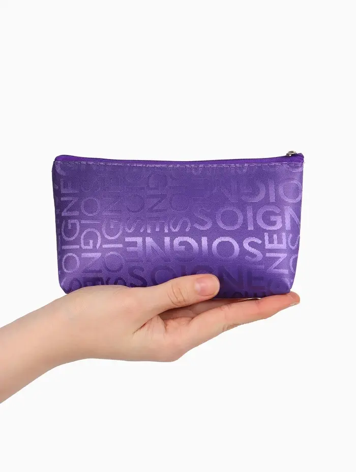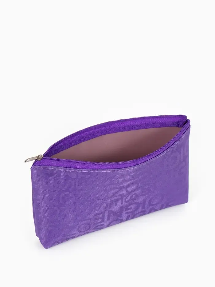 Эта фиолетовая косметичка с буквами — компактный органайзер для самого необходимого. Она легко помещается в сумку или рюкзак, сохраняя порядок и мгновенно находясь под рукой. Практичный нейлон надёжно защищает содержимое, а нейтральный принт добавляет образу стильную деталь.