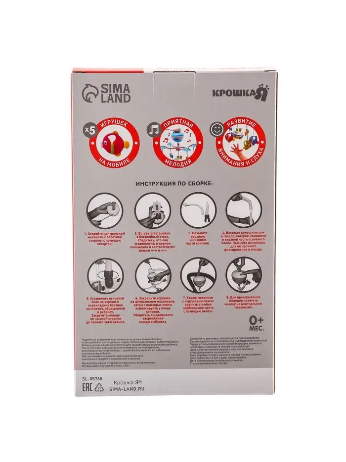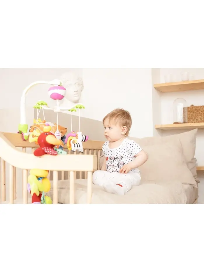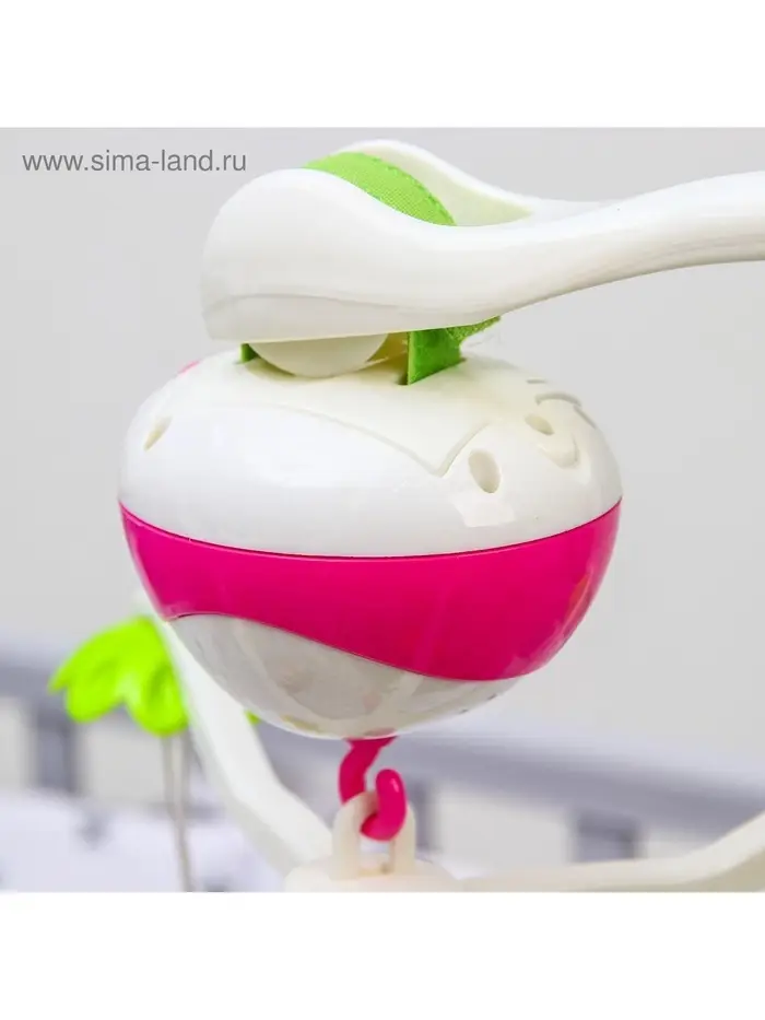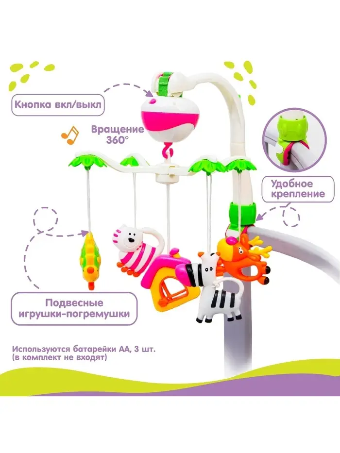 - 5 ярких игрушек над кроваткой медленно крутятся, привлекая внимание ребёнка. Их можно снять и использовать отдельно для игры.