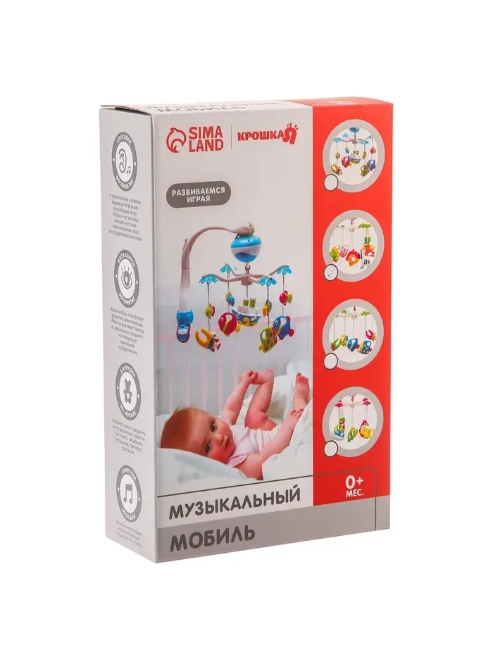 Мобиль сделан из прочного пластика без острых углов. Подходит для новорождённых. Игрушки лёгкие, ребёнок не поранится, если случайно дотронется. Мелодии негромкие, не перегружает слух.