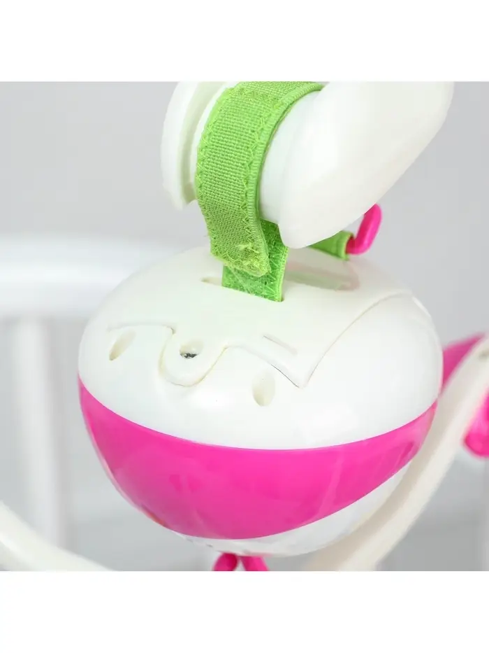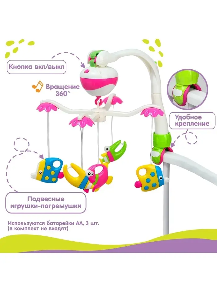 - 4 яркие игрушки над кроваткой медленно крутятся, привлекая внимание ребёнка. Их можно снять и использовать отдельно для игры.