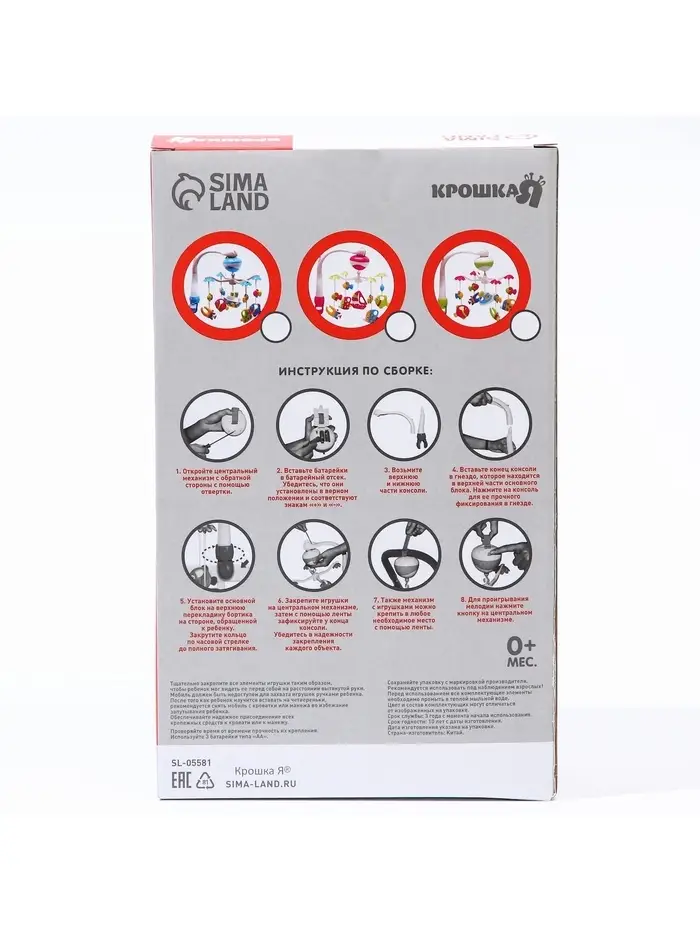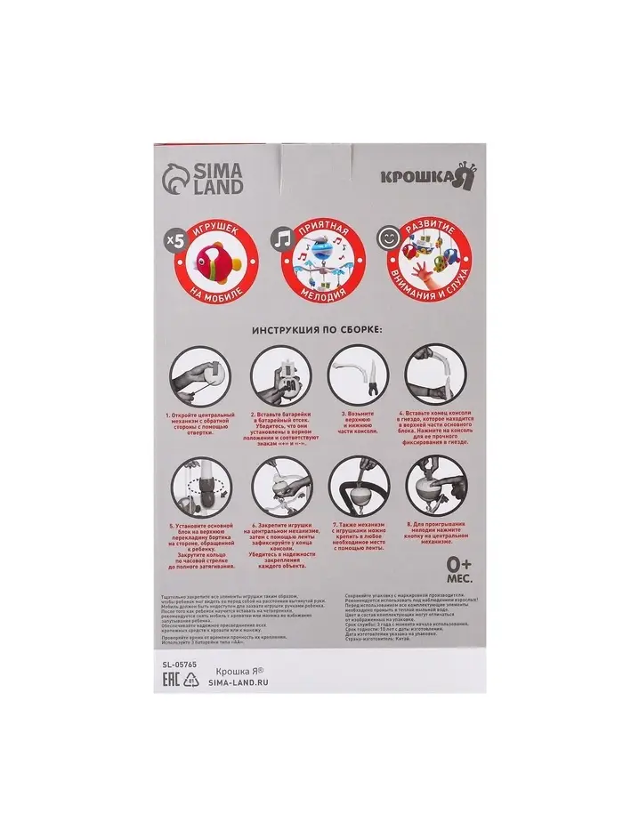 - Музыкальный блок работает от 3 батареек типа АА — мобиль проигрывает 8 мелодий и плавно вращается. Это успокаивает малыша и развивает зрительное восприятие.