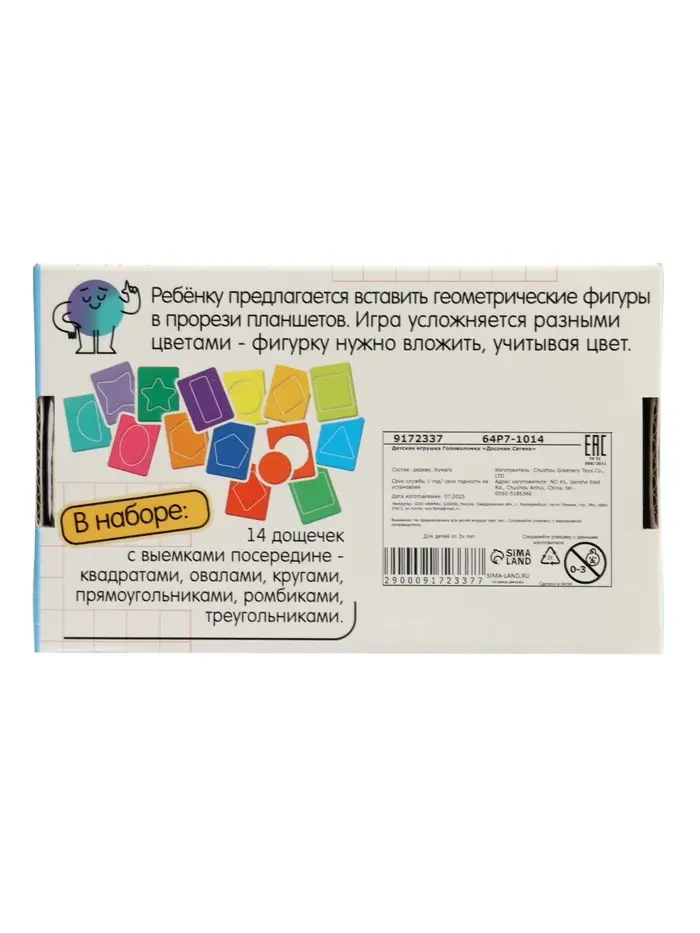 Головоломка «Досочки Сегена» — это классическая развивающая игра, созданная по методике Эдуарда Сегена. В комплект входят досочки с выемками и соответствующие им фигурные вкладыши, которые ребёнку нужно будет вставлять на свои места. Простая, но эффективная головоломка развивает мелкую моторику, логическое и пространственное мышление, а также помогает в изучении форм и цветов.
