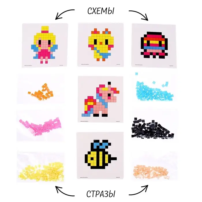 Термостразы созданы для декорирования ткани и аксессуаров. В наборе вы найдёте 5 схем выкладки и 6 пакетиков со стразами.