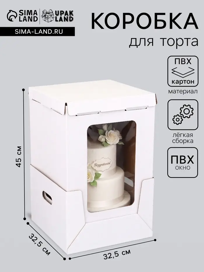 - Вместительный размер для высоких тортов: Высота коробки 45 см подходит для многоярусных композиций, тортов на подставке-колонне или десертов с высоким декором. Габариты 32.5х32.5 см соответствуют стандартным размерам праздничных тортов.