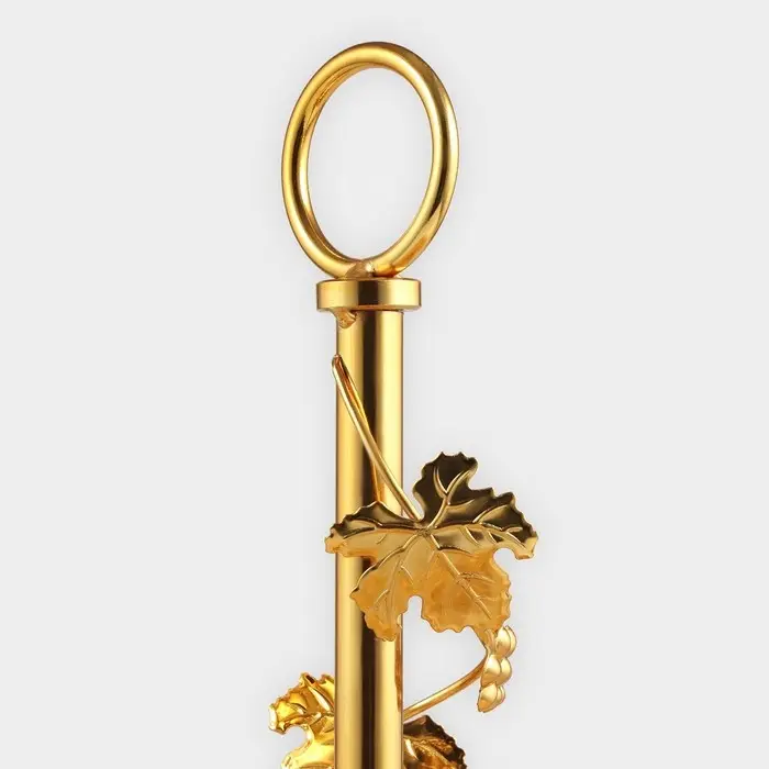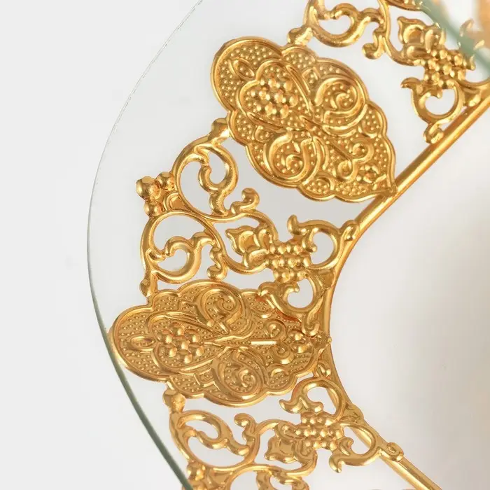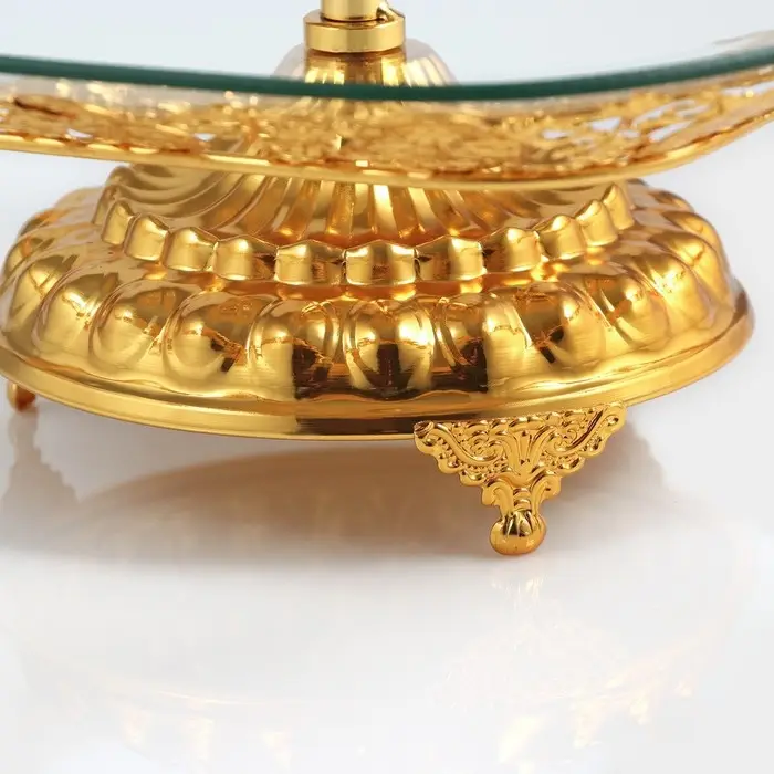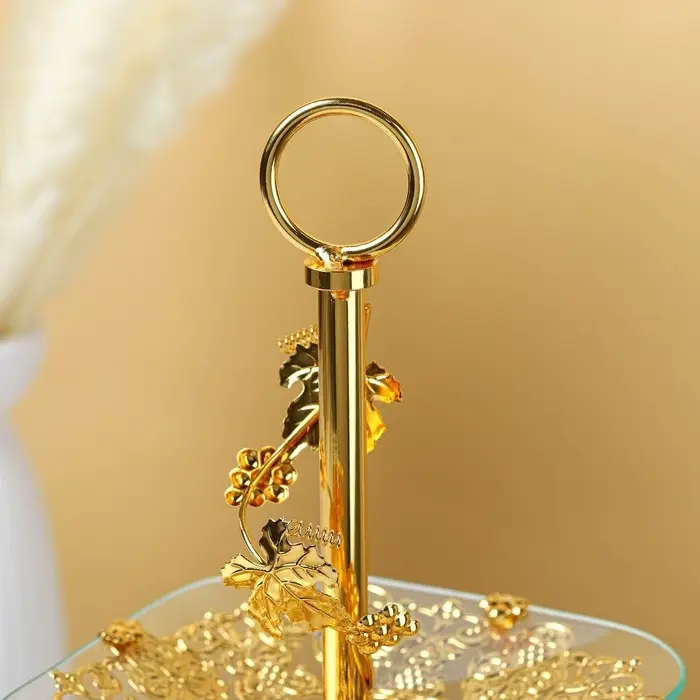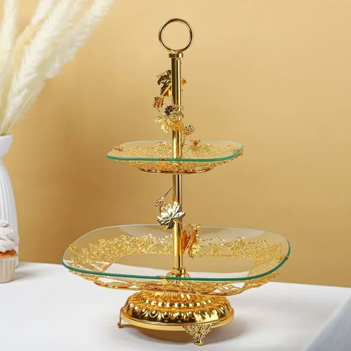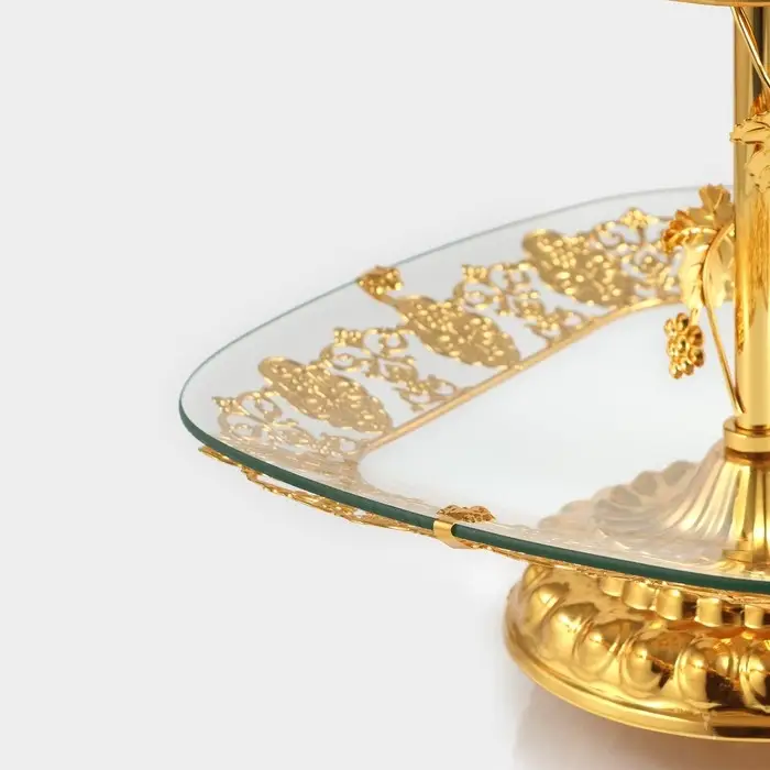 Двухъярусная стеклянная этажерка с золотистым каркасом — для фруктов, десертов или декора. Верхний ярус 21 см, нижний — 29 см: разная вместимость под разные нужды.
