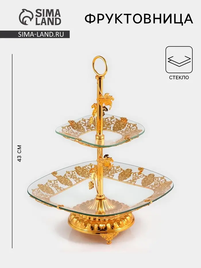 Этажерка-фруктовница квадратная, 2 яруса, 29×29 см, 17×17 см, высота 43 см, стекло, золотистая
