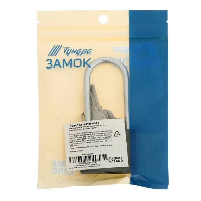 Замок навесной ТУНДРА, основание 45 мм, длинная дужка, 3 ключа, подвес