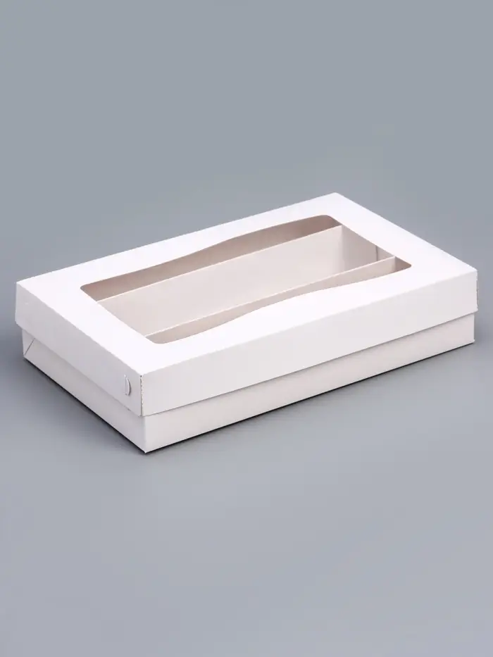- Удобство и надёжность: Картон плотностью 250 г/м² защищает содержимое от внешних воздействий. Прозрачный ложемент позволяет видеть десерты, не открывая коробку. Коробка закрывается крышкой из того же картона.
