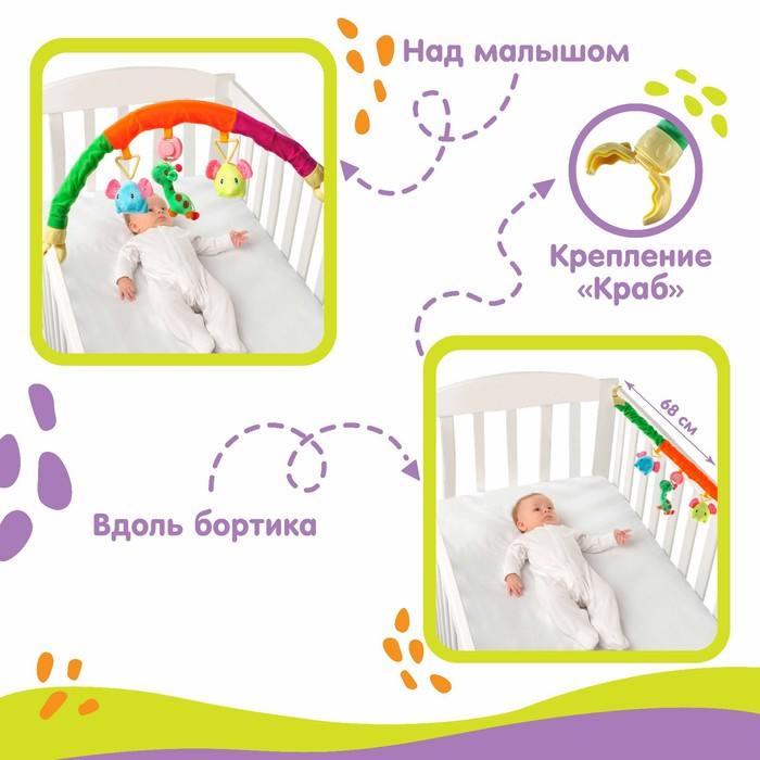 Эту дугу можно закрепить на детской кроватке, коляске или автокресле с помощью удобных прищепок. Угол наклона дуги регулируется. Сначала малыш будет просто рассматривать яркие игрушки, лежа на спинке, но со временем он обязательно начнет тянуться к ним ручками и ножками, совершенствуя свои двигательные навыки. Игрушки на дуге имеют различные цвета и формы, в том числе материал — специально для развития тактильных ощущений малышей. Изделие изготовлено из текстильных материалов с элементами пластмассы.