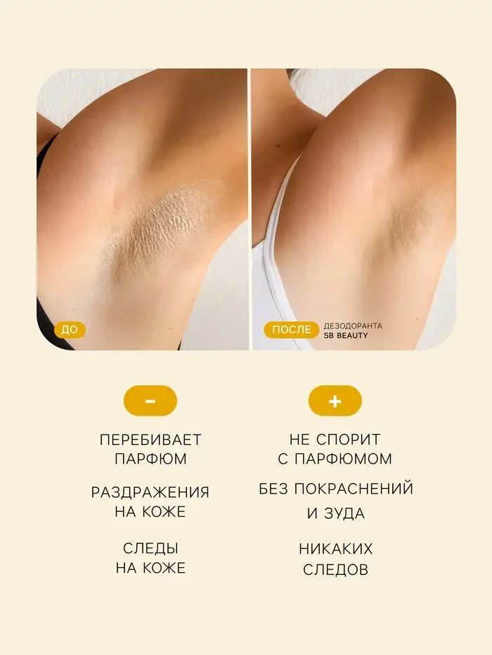 Свойства: абсолютно безвреден для организма, так как в отличие от многих современных дезодорантов не содержит хлоргидрат алюминия и прочие вредные химические субстанции. В нем отсутствуют эмульгаторы, закупоривающие поры и потовые протоки, нарушающие функцию потовых желез. Не содержит спирта, не вызывает раздражения или аллергии. В его состав не входят масла, оставляющие пятна на одежде. Единственный безвредный дезодорант, разрешенный к применению беременным и кормящим женщинам.