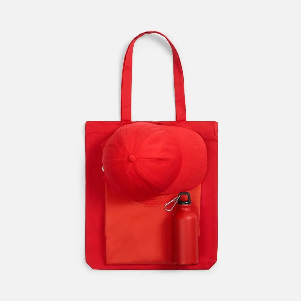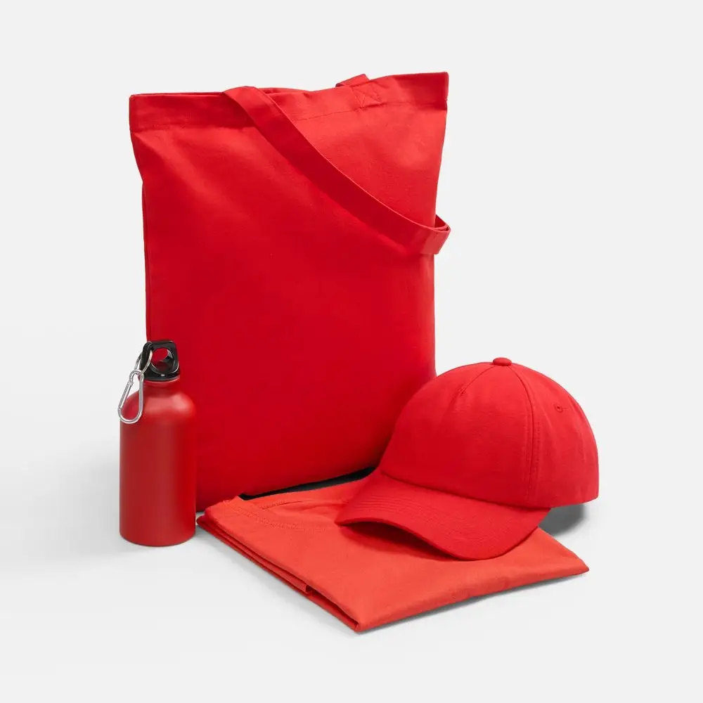 футболка - хлопок 100%, гребенная пряжа (пенье), плотность 160 г/м²; джерси; бейсболка - полиэстер, 75%; хлопок, 25%, плотность 170 г/м²; джерси; бутылка - алюминий; крышка - пластик; сумка - хлопок 100%, плотность 220 г/м²; саржа