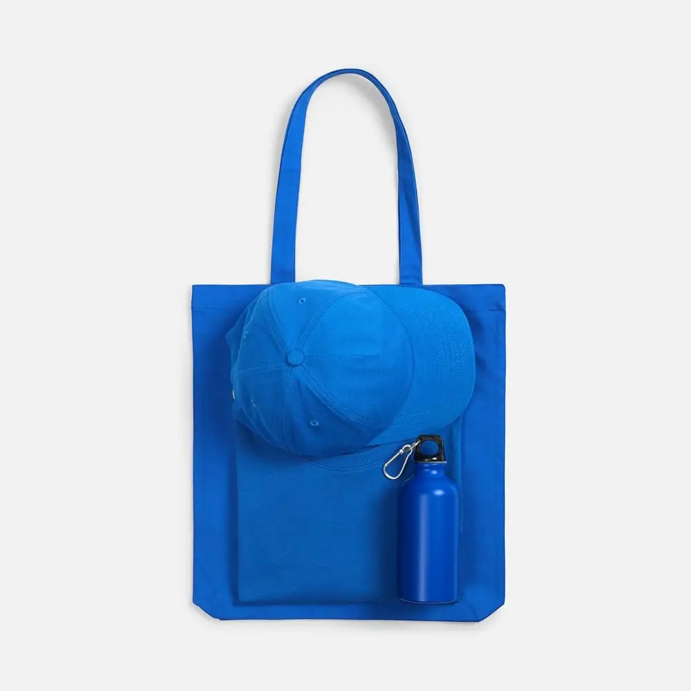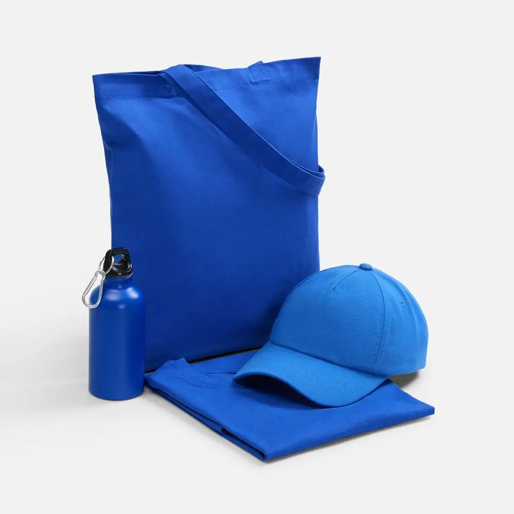 футболка - хлопок 100%, плотность 140 г/м²; джерси; бейсболка - полиэстер, 75%; хлопок, 25%, плотность 170 г/м²; джерси; бутылка - алюминий; крышка - пластик; сумка - хлопок 100%, плотность 220 г/м²; саржа