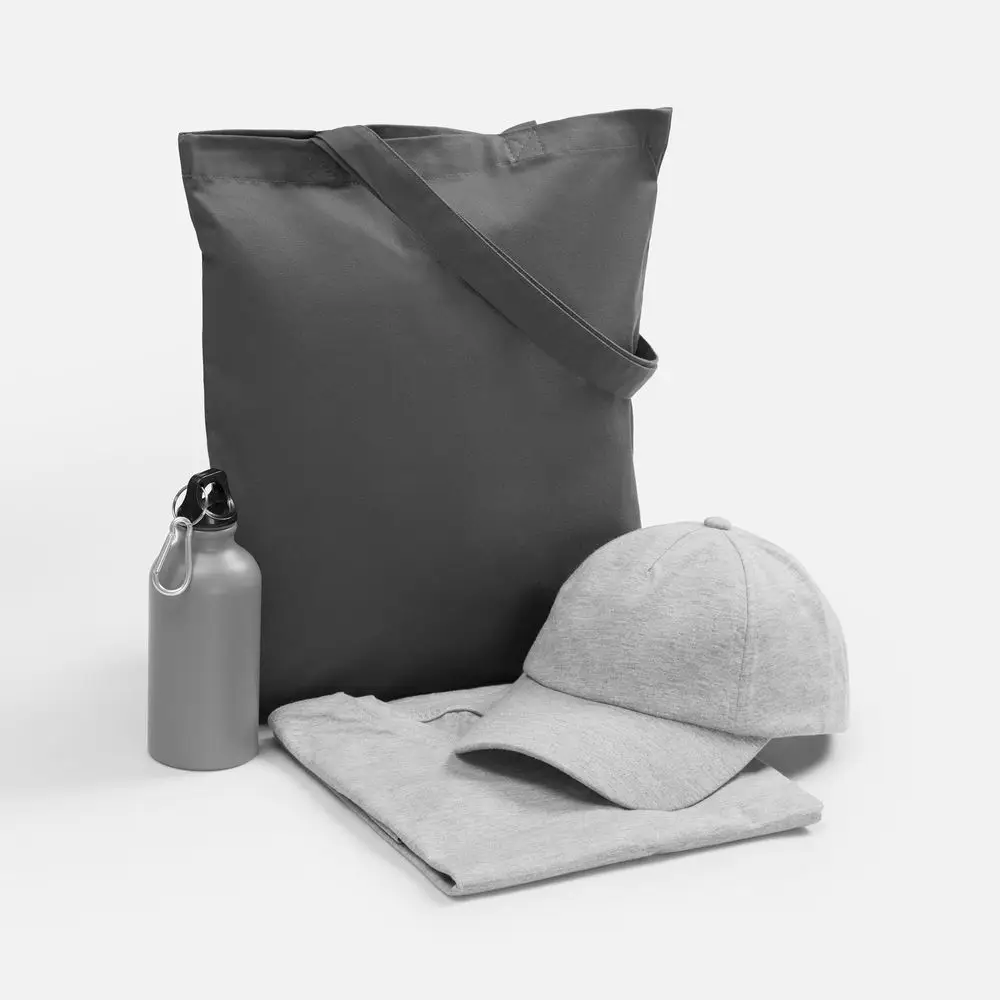 футболка - хлопок 100%, гребенная пряжа (пенье), плотность 160 г/м²; джерси; бейсболка - полиэстер, 75%; хлопок, 25%, плотность 170 г/м²; джерси; бутылка - алюминий; крышка - пластик; сумка - хлопок 100%, плотность 220 г/м²; саржа