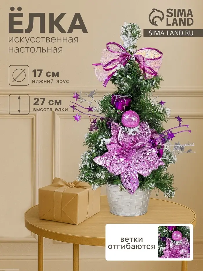 - Тип — настольная ёлка, которая компактно размещается на рабочем столе, подоконнике или полке. Её небольшие размеры позволяют легко интегрировать её в любое пространство, создавая праздничное настроение в самых неожиданных уголках вашего дома.
