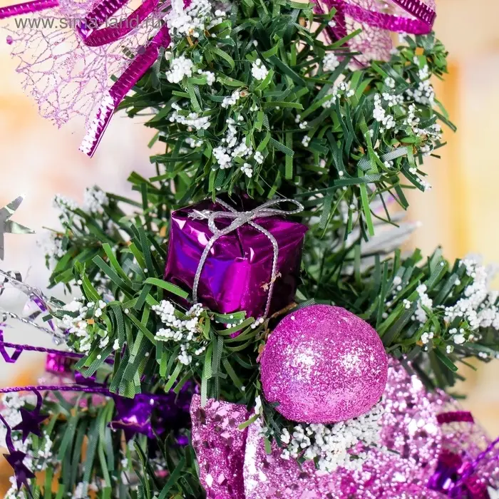 - Декор — украшения сиреневого цвета усиливают сезонную тематику и добавляют образу движения и тепла. Эти нежные акценты создают эффектный контраст с зелёной хвоей, придавая ёлке изысканный и современный вид.