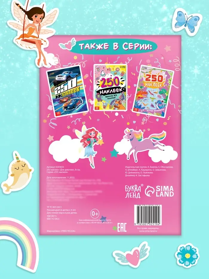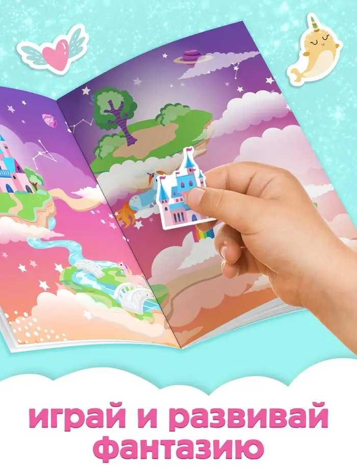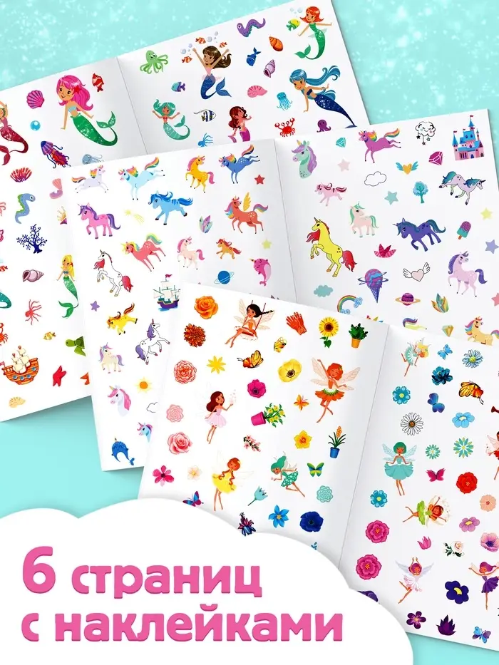 В альбоме представлено 250 стикеров с красочными изображениями сказочных персонажей — фей, принцесс, единорогов и т.п.