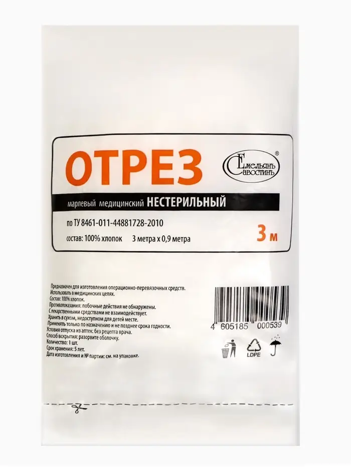 Размер 0,9 × 3 метра является оптимальным для домашнего использования: отрез удобно хранить, а также легко разрезать на куски нужного размера — для перевязок, салфеток, тампонов или компрессов. Равномерное плетение обеспечивает аккуратную работу с материалом и снижает вероятность осыпания при нарезке.