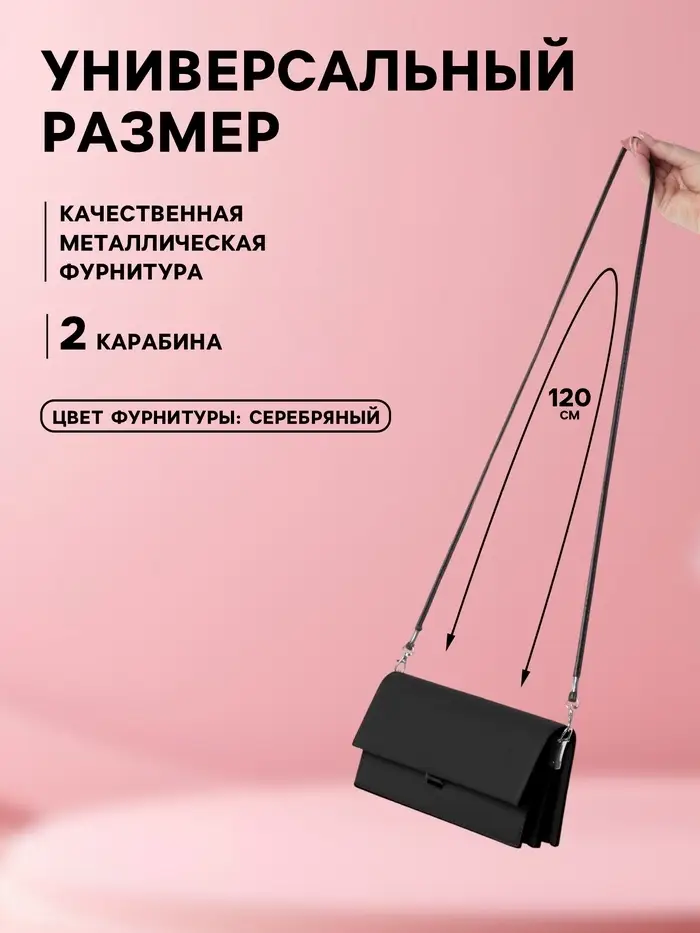 - Длина — 120 см, обеспечивает комфортное ношение через плечо или на плече.